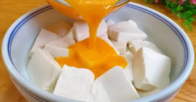 把豆腐煎至金黃,淋入雞蛋液,這做法還是第一次見,鮮嫩多汁很美味