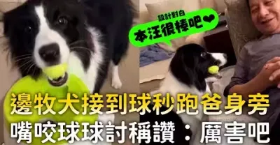 邊牧犬接到球秒跑爸身旁 嘴咬球球討稱讚:厲害吧