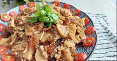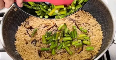 米飯里加入蘆筍和香菇,味道竟然像豬肉燜飯,第一次用"蜂窩鍋"做飯,竟想不到的美味還會有鍋巴呢!~素食Vegan-