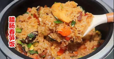 一家五口晚餐臘腸春筍燜飯,再煎幾隻螃蟹解解饞!
