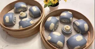 雙色花樣饅頭,藍天白雲造型饅頭做法: Blue sky white cloud two-toned patterned steamed buns.