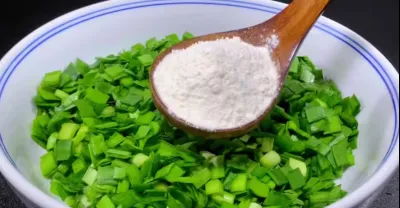 將麵粉倒入韭菜里,筷子一攪手不沾面就能成烙餅,柔軟勁道特別香