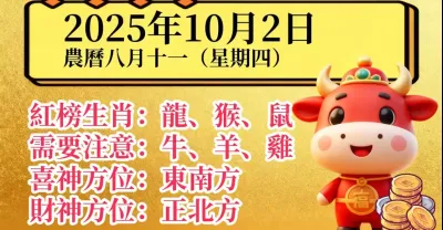 明日小運播報~2025 年 10 月 2 日(星期四)農曆八月十一